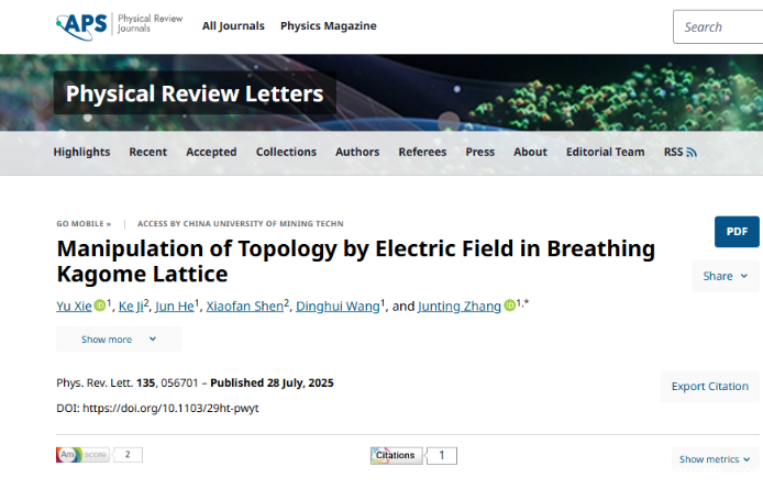 近日,我校材料与物理学院张俊廷教授课题组在磁性拓扑物态的电场调控方面取得重要研究进展,相关成果以“Manipulation of Topology by Electric Field in Breathing Kagome Lattice”为题发表在物理顶级综合学术期刊《Physical Review Letters》(IF = 9.1)上。材料与物理学院研究生谢禹为论文第一作者,张俊廷教授为通讯作者,华体汇app为第一单位。